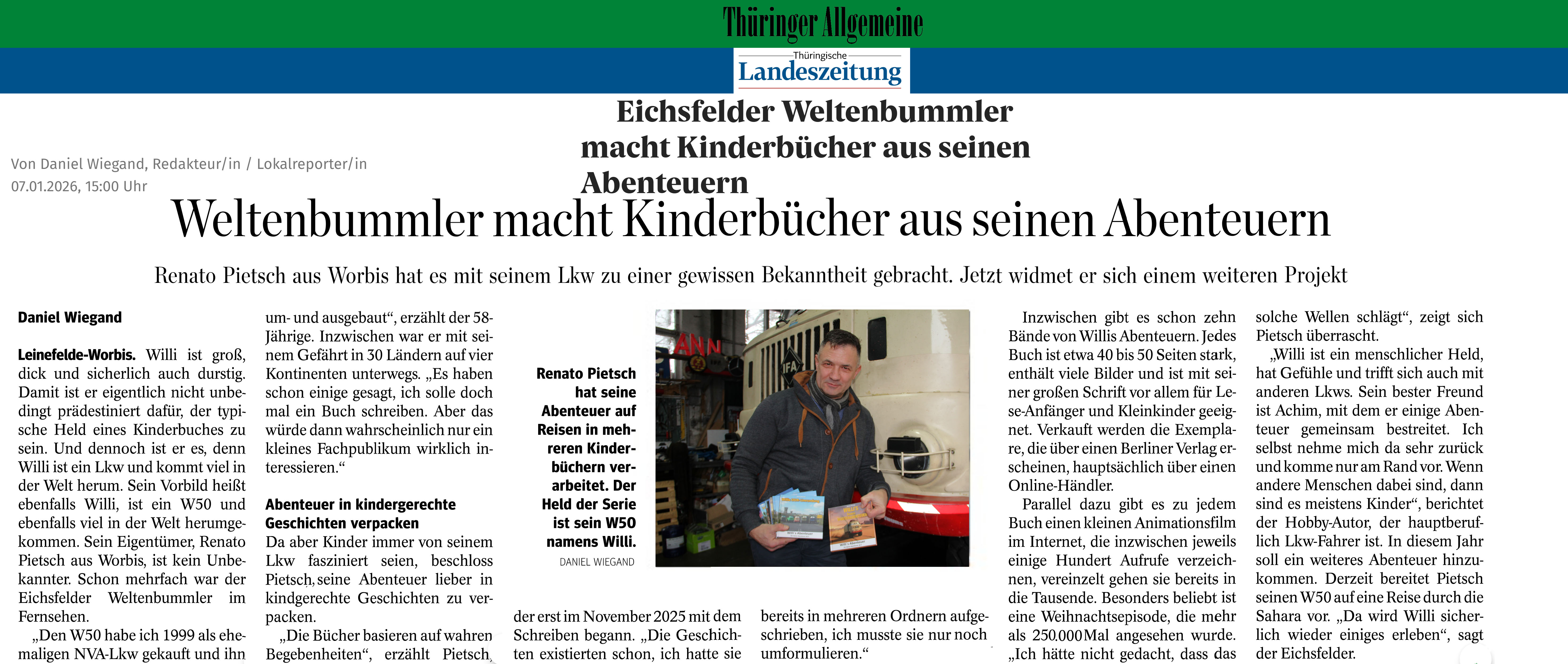 „Willi ist ein menschlicher Held, hat Gefühle und trifft sich auch mit anderen Lkws. Sein bester Freund ist Achim, mit dem er einige Abenteuer gemeinsam bestreitet. Ich selbst nehme mich da sehr zurück und komme nur am Rand vor. Wenn andere Menschen dabei sind, dann sind es meistens Kinder“, berichtet der Hobby-Autor, der hauptberuflich Lkw-Fahrer ist. In diesem Jahr soll ein weiteres Abenteuer hinzukommen. Derzeit bereitet Pietsch seinen W50 auf eine Reise durch die Sahara vor. „Da wird Willi sicherlich wieder einiges erleben“, sagt der Eichsfelder.